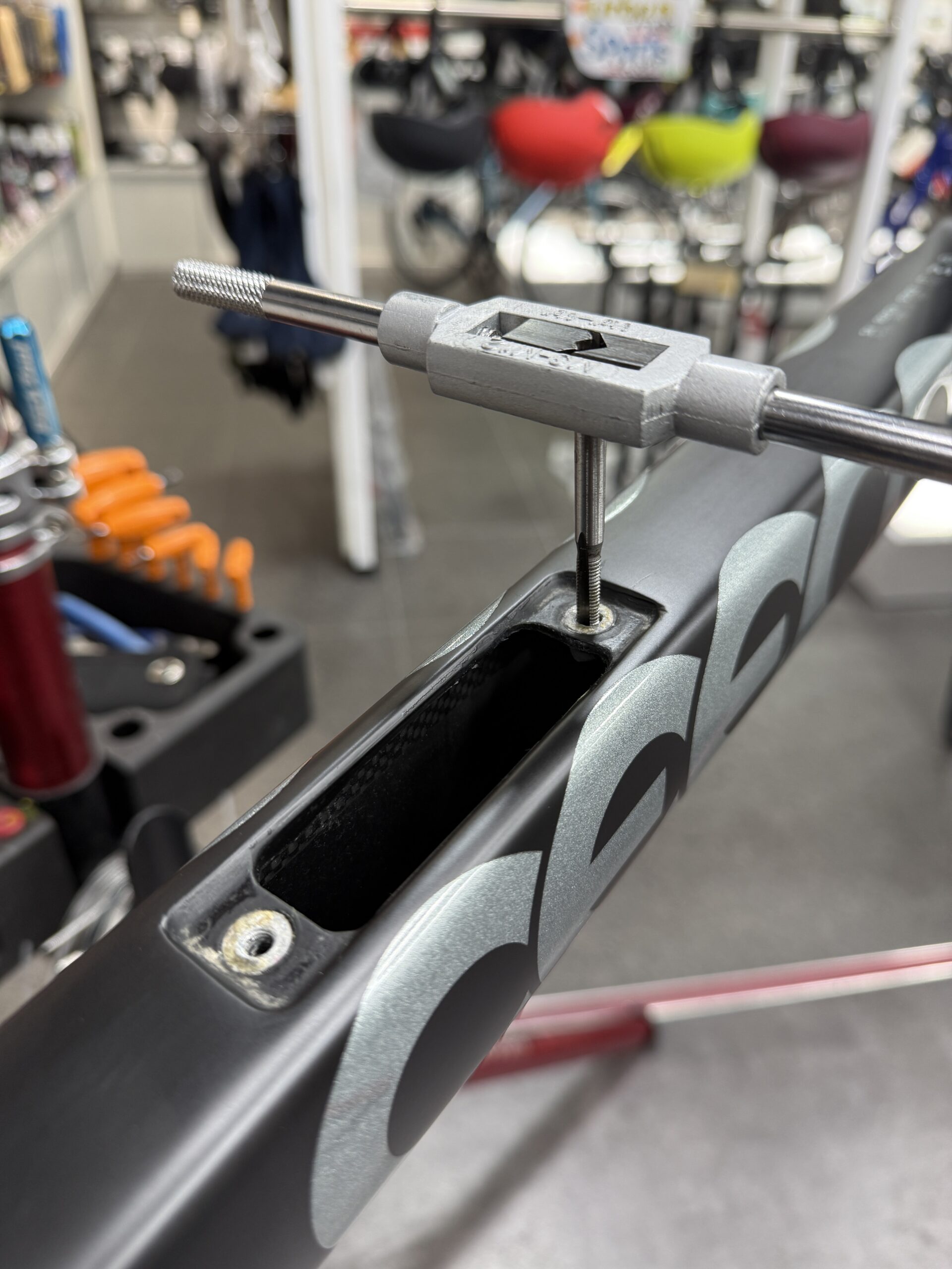 車体の清掃が終わりますと、ブレーキホースや、変速ケーブルを取り回します🧰