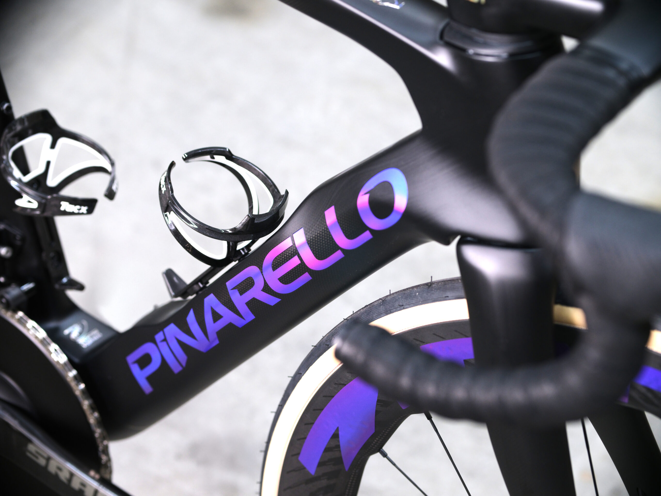 トップチューブにはピナレロとティソのロックアップロゴと、時間の流れをモチーフにしたグラフィックが描かれています。