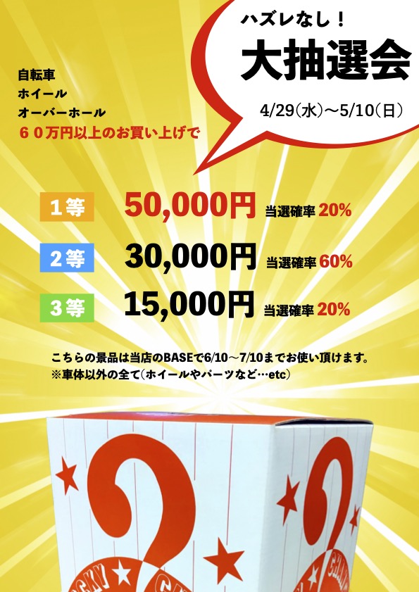くじ引きは最大1等50,000円分の当店オンラインショップBASEでご利用頂けるクーポンを進呈いたします!!
