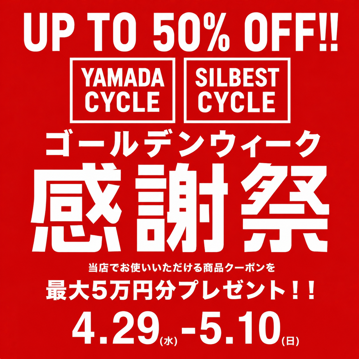 ゴールデンウィーク感謝祭 開催します❗️4/29(水)~5/10(日) 最大5万円プレゼント🎁ヤマダサイクルセンター神戸三宮⛰️シルベストサイクル大阪梅田🌇